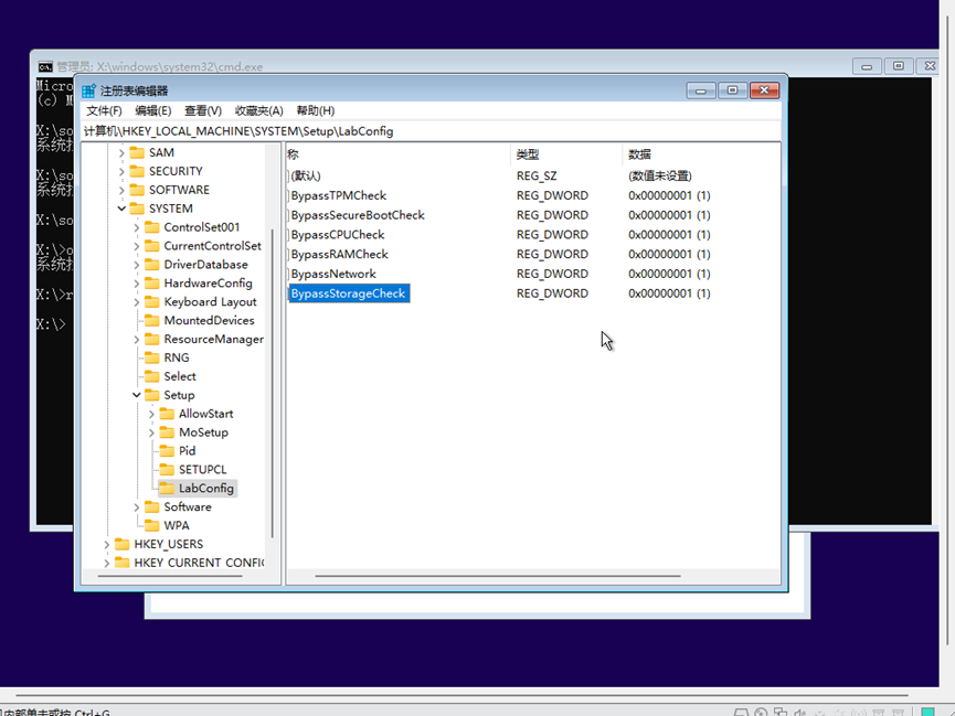 7. 安装界面按 Shift+F10,输入 regedit 修改注册表跳过 TPM