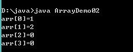 1public class ArrayDemo02 { 2 public static void main(String[] args) { 3 int[] arr = new int[4]; // 定义可以存储4个整数的数组 4 arr[0] = 1; // 为第1个元素赋值1 5 arr[1] = 2; // 为第2个元素赋值2 6 // 下面的代码是打印数组中每个元素的值 7 System.out.println("arr[0]=" + arr[0]); 8 System.out.println("arr[1]=" + arr[1]); 9 System.out.println("arr[2]=" + arr[2]); 10 System.out.println("arr[3]=" + arr[3]);