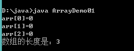 1public class ArrayDemo01 { 2 public static void main(String[] args) { 3 int[] arr; // 声明变量 4 arr = new int[3]; // 创建数组对象 5 System.out.println("arr[0]=" + arr[0]); // 访问数组中的第一个元素 6 System.out.println("arr[1]=" + arr[1]); // 访问数组中的第二个元素 7 System.out.println("arr[2]=" + arr[2]); // 访问数组中的第三个元素 8 System.out.println("数组的长度是:" + arr.length); // 打印数组长度 9 } 10}