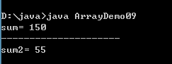 class ArrayDemo09 { public static void main(String[] args){ //一维数组的求累加和并遍历 int[] arr = {10,20,30,40,50}; int sum = 0; for (int i=0; i<arr.length; i++) { //System.out.println(arr[i]); sum += arr[i]; } System.out.println("sum= " + sum); System.out.println("---------------------"); //二维数组的求累加和并遍历 int[][] arr2 = { {1,2},{3,4,5},{6,7,8,9,10} }; int sum2 = 0; for (int i=0; i<arr2.length; i++) { for (int j=0; j<arr2[i].length; j++) { //System.out.println(arr2[i][j]) sum2 += arr2[i][j]; } } System.out.println("sum2= "+ sum2); } }