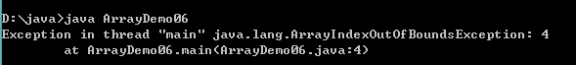 1public class ArrayDemo06 { 2 public static void main(String[] args) { 3 int[] arr = new int[4]; // 定义一个长度为4的数组 4 System.out.println("arr[0]=" + arr[4]); // 通过角标4访问数组元素 5 } 6}