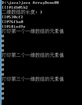 class ArrayDemo08 { public static void main(String[] args){ //定义二维数组的方式 int[][] arr = new int[3][4]; System.out.println( arr ); System.out.println("二维数组的长度: " + arr.length); //获取二维数组的3个元素 System.out.println( arr[0] ); System.out.println( arr[1] ); System.out.println( arr[2] ); System.out.println("打印第一个一维数组的元素值"); System.out.println( arr[0][0] ); System.out.println( arr[0][1] );//访问的为二维数组中第1个一维数组的第2个元素 System.out.println( arr[0][2] ); System.out.println( arr[0][3] ); System.out.println("打印第二个一维数组的元素值"); System.out.println( arr[1][0] ); System.out.println( arr[1][1] ); System.out.println( arr[1][2] ); System.out.println( arr[1][3] ); System.out.println("打印第三个一维数组的元素值"); System.out.println( arr[2][0] ); System.out.println( arr[2][1] ); System.out.println( arr[2][2] ); System.out.println( arr[2][3] ); } }