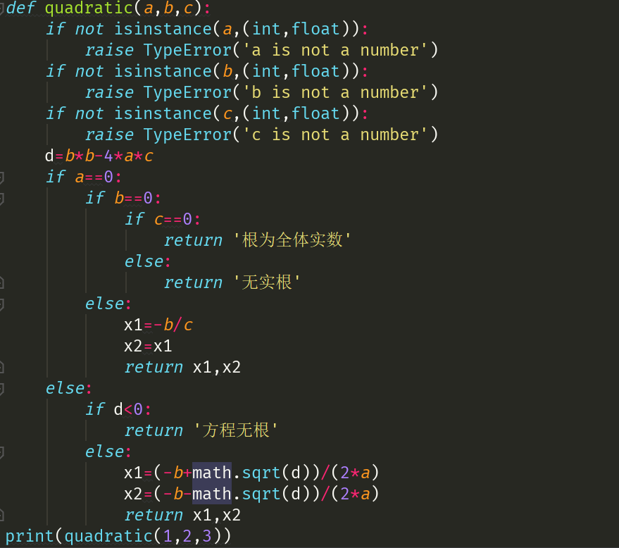 eg:请定义一个函数quadratic(a, b, c),接收3个参数,返回一元二次方程:ax2 + bx + c = 0的两个解。