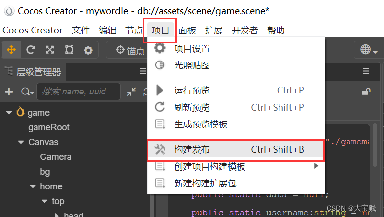 实现微信登陆需要调用微信的SDK,只能在微信开发者工具中测试。所以先介绍一下如何构建发布游戏。在Cocos Creator中点击“项目”-->“构建发布”: