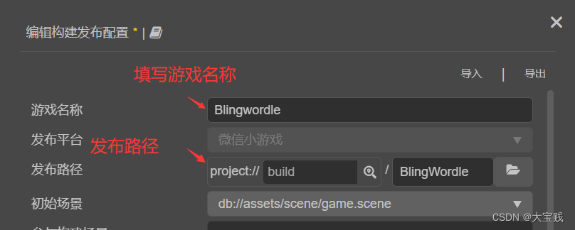 填写游戏名称,发布路径:默认使用build文件夹,按照此设置发布后会在你的Cocos Creator项目路径下生成一个build文件夹,打包后的文件会存放在build文件夹下的BlingWordle文件夹中。