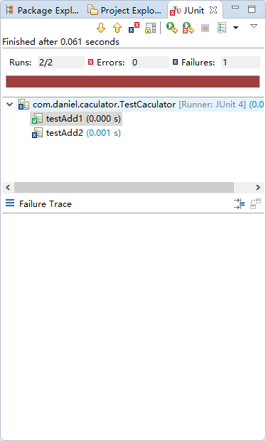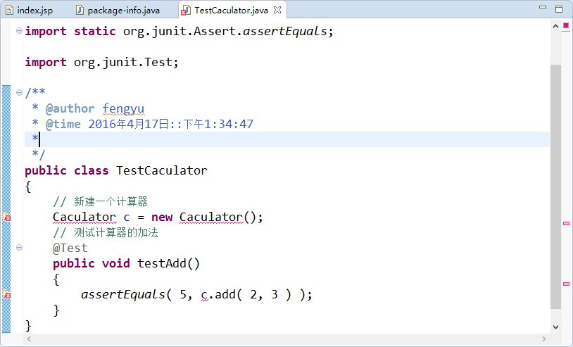 2、在src/test/java目录下编写测试类TestCaculator。为了简便,首先假设我们的计算器需求是能计算加法(其他的运算暂时不考虑)。