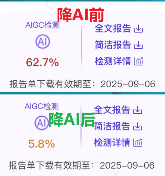 10、经过上述修改后,务必使用同一查重系统(知网)重新检测AIGC重复率。一般学校要求ai率不高于30%,所以20%以内就比较安全。