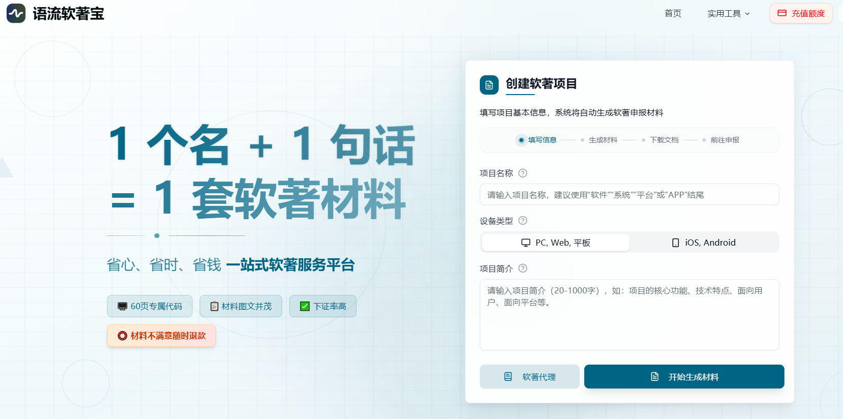 语流软著宝是一个专注于提升软著申请效率的AI工具,依托数千次真实软著申请经验,严格遵守鉴别材料的格式和质量要求,一键生成格式、用语、技术交底符合鉴别标准的高质量文档,辅助软著代理、高新技术企业等机构和个人快速完成软著申请材料的准备。
