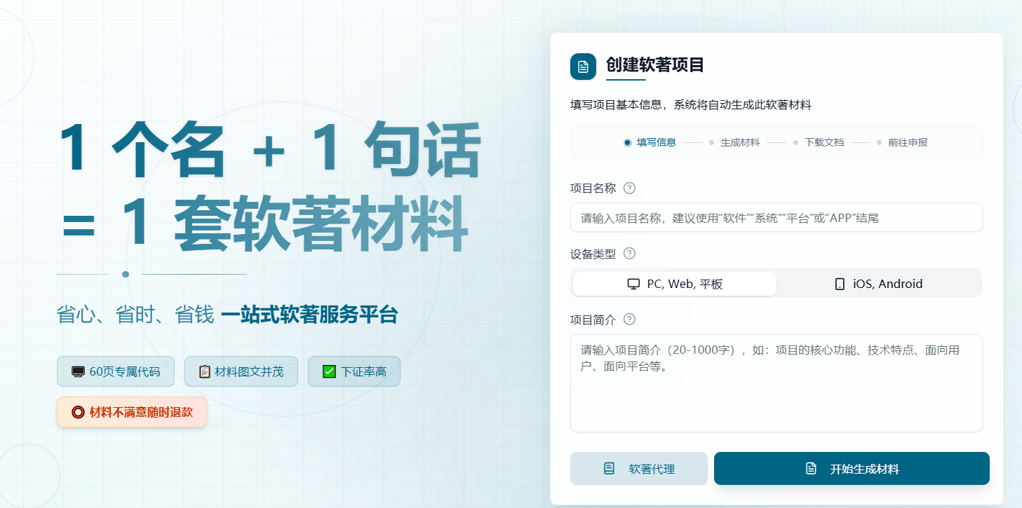 浏览器打开语流软著宝 - 30分钟完成软件著作权申报 | 软著AI智能材料系统 → 点击“创建软著项目” → 填名称+简介选择设备类型、开发完成日期、合作/独立开发选项→软著宝正在后台工作: