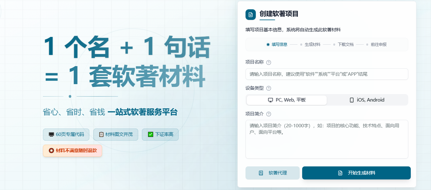 输入“软件名称+一句功能描述”,自动输出60页代码(含排版)、15页说明书、5张UI示意图,可直接替换上述模板;