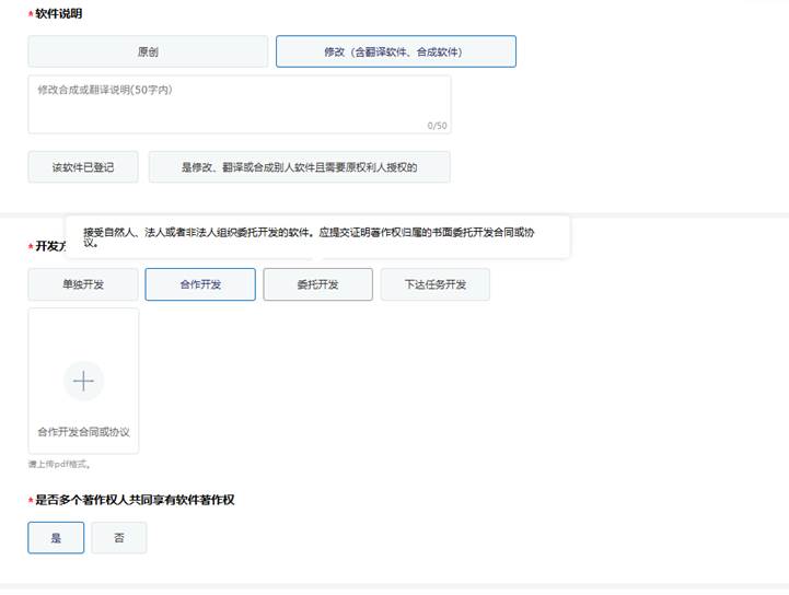 【开发方式】独立开发:只依靠自身条件单独开发完成的软件。合作开发:由两个以上的自然人、法人或者非法人组织合作开发的软件。应提交证明著作权归属的书面合作开发合同或协议。委托开发:接受自然人、法人或者非法人组织委托开发的软件。应提交证明著作权归属的书面委托开发合同或协议。下达任务开发:由国家机关下达任务开发的软件。应提交证明著作权归属的书面项目任务书或合同。