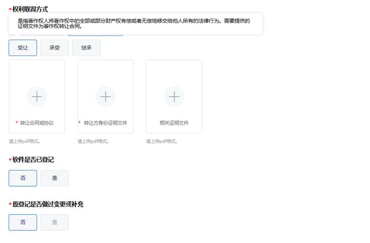 一般情况默认是【原始取得】、【全部权利】,无需修改,除非软著是别人转让给你、或者你和别人合作开发。