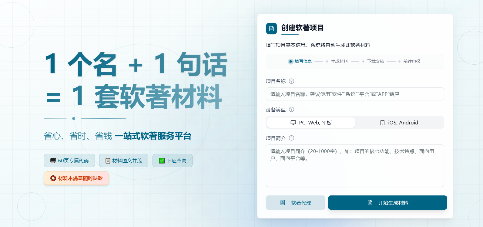 3步搞定:输入项目名称和简介(如“电商管理系统”),选择设备类型(如PC/Android),一键生成申请表、说明书、源代码,并排版完成。