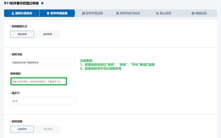 填写申请软著得取得方式、软著名称、版本号等信息。