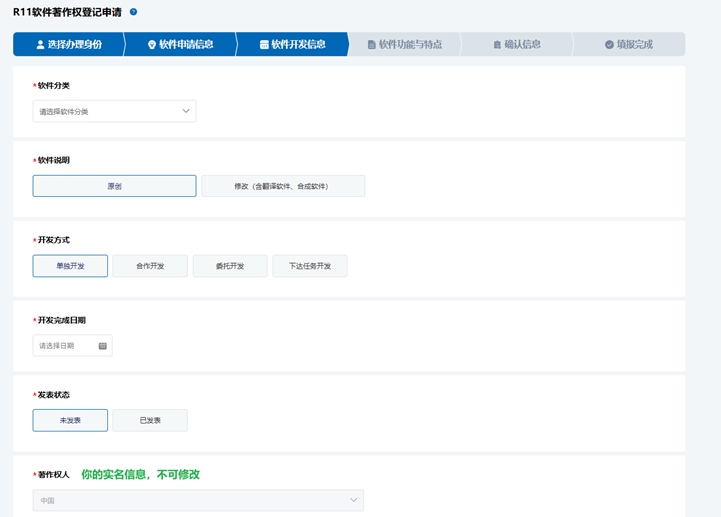 【开发方式】独立开发:只依靠自身条件单独开发完成的软件。合作开发:由两个以上的自然人、法人或者非法人组织合作开发的软件。应提交证明著作权归属的书面合作开发合同或协议。委托开发:接受自然人、法人或者非法人组织委托开发的软件。应提交证明著作权归属的书面委托开发合同或协议。下达任务开发:由国家机关下达任务开发的软件。应提交证明著作权归属的书面项目任务书或合同。