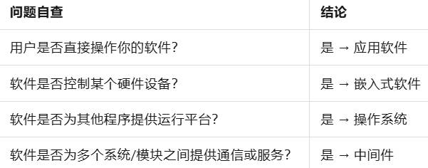 例如:微信、Photoshop、财务系统、APP,运行在操作系统之上,用户直接使用,属于应用软件。Windows、Linux、Android、iOS属于操作系统。运行在硬件设备内部(如芯片、传感器、控制器) → 嵌入式软件。数据库中间件、消息队列(如Kafka)、Web服务器(如Tomcat)则属于中间件。