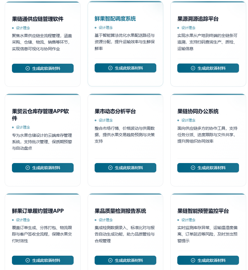 例如,我输入“水果供应链管理”,会给我推荐《果贸云仓库存管理APP软件》、《鲜果智配调度系统》等软著名称及简介。