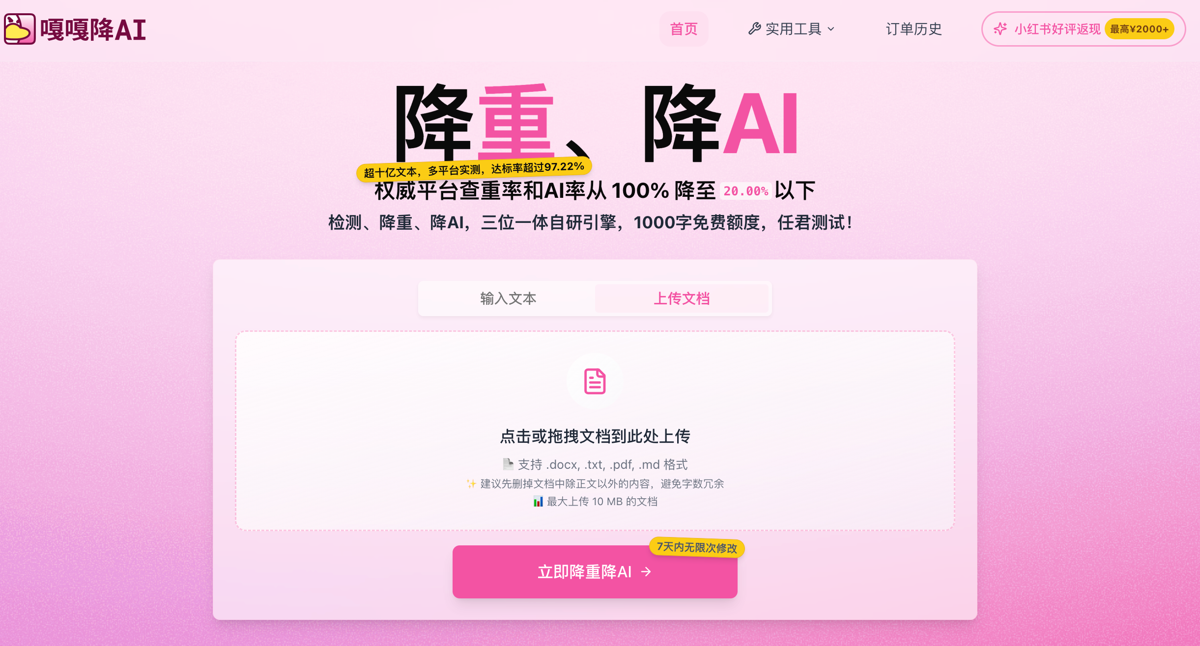 嘎嘎降AI只有打开官网,就送1000字免费额度,任君测试。在平台检测后,如果AI率还是高于20%,秒退款。