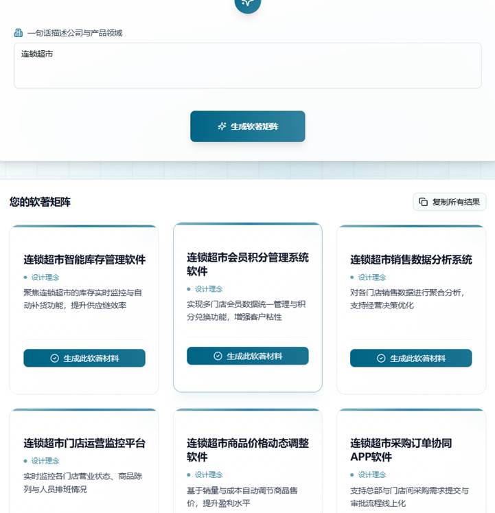 输入业务的描述如“连锁超市“,语言软著AI会智能生成20个相关名称和简介,点击生成→ 矩阵规划器。