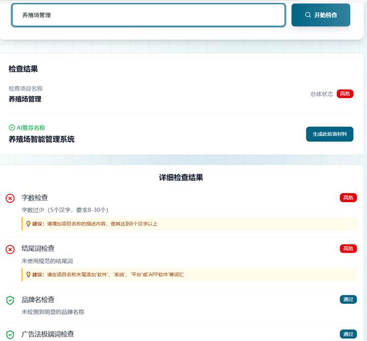 第一次申请软著,不知道这些规定?别愁,1个软著AI预审工具,自动检测识别软著名称中的问题,并提供修改建议,超好用。AI预审入口