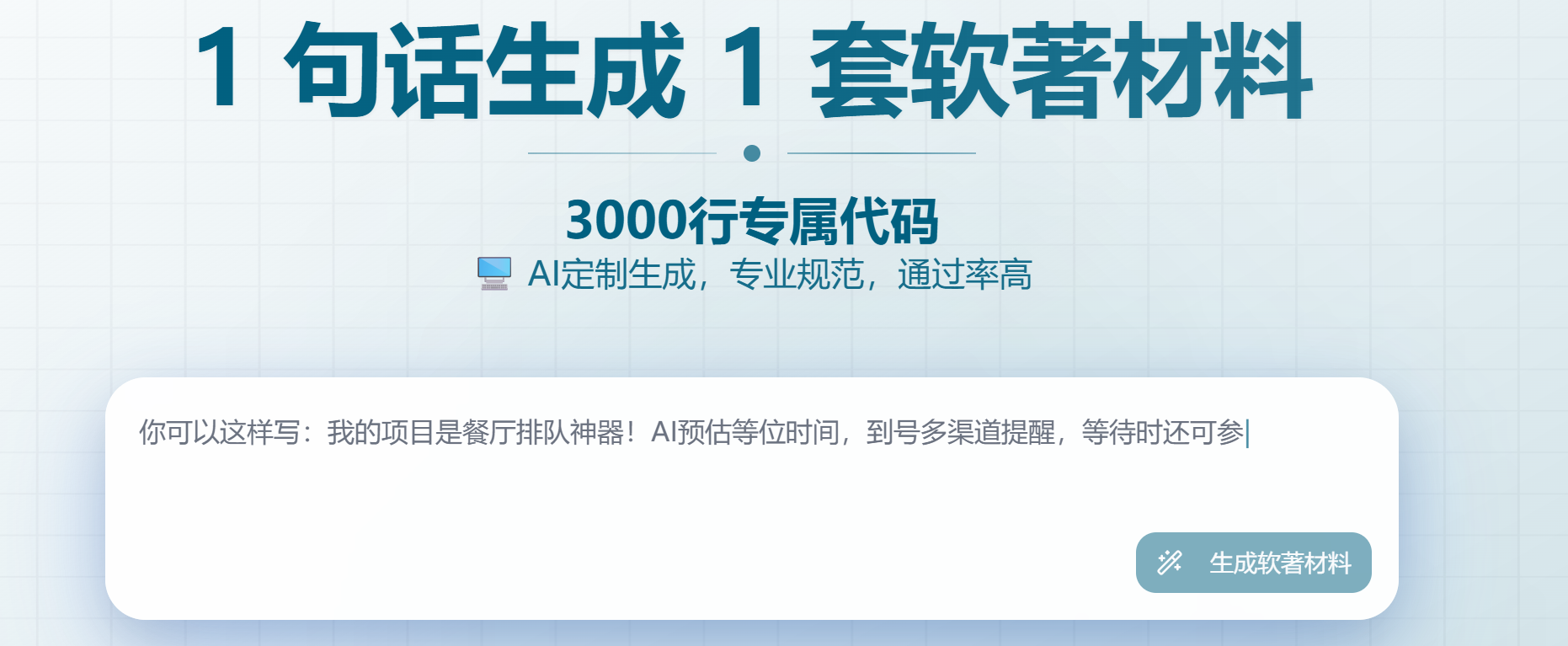 语流软著宝根据项目名称和简介、定制生成页面、操作文档和代码,降低自己动手DIY申请软著的门槛,1、2个小时就能搞定了软著申请。
