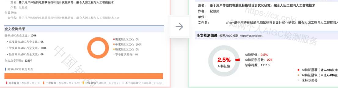 3、对照式降AI:方便用户对比降AI前后的内容,清晰了解修改内容与提升效果。