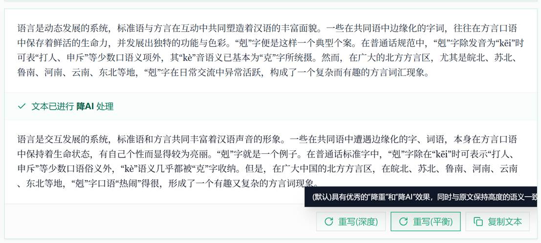 4. 查看下载降AI后的内容:十几秒,比话降AI就会处理好内容,你可以对照查看前后的内容差异,不满意可以点击重写,重新修改内容。