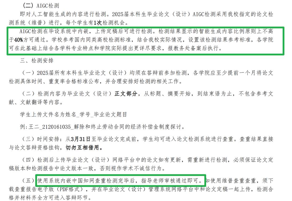 2025年起,高校已明确要求毕业论文要检测AIGC率,AI率高于30%或40%就不能参加答辩,而部分学校、硕士论文更加严格,要求在20%以内。