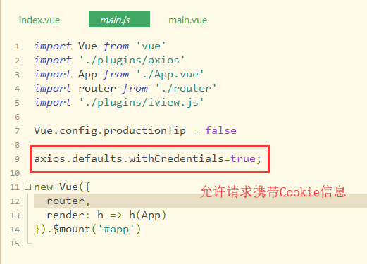 一、在Vue项目的 main.js 中,设置允许携带Cookie信息。代码如下