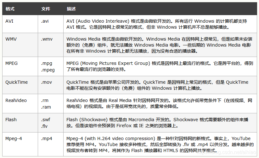 4.1. MP4格式是一种新的即将普及的因特网视频格式。HTML5、Flash播放器以及优酷等视频网站均支持它。
