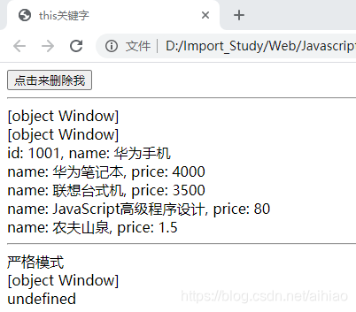 <button onclick="this.style.display='none'">点击来删除我</button> // this是button元素