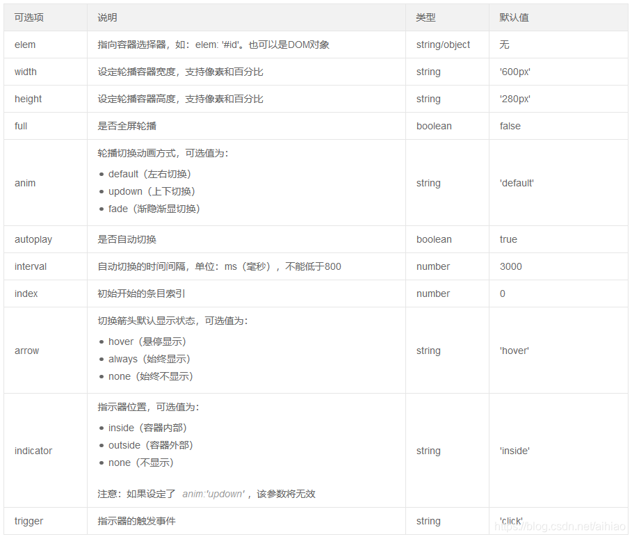 2.1. 通过核心方法: carousel.render(options)来对轮播设置基础参数。也可以通过方法: carousel.set(options)来设定全局基础参数。