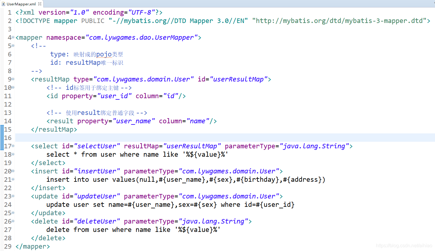 4. 在和UserMapper.java接口同一目录下新建UserMapper.xml映射文件