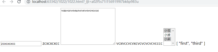 1 <div id="app"> 2 <input type="text" v-model="input"> {{input}} 3 <textarea name="" id="" cols="30" rows="10" v-model="article"></textarea> {{article}} 4 <select name="" v-model="lady" multiple> 5 <option value="first">小苍</option> 6 <option value="second">小波</option> 7 <option value="third">小麻</option> 8 </select> 9 {{lady}} 10 </div> 11 <script> 12 const app=new Vue({ 13 el:'#app', 14 data:{ 15 input:'', 16 article: '', 17 lady:['first','third'] 18 } 19 }) 20 </script>