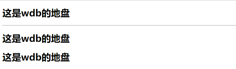 1 <div id="app"> 2 <wdb></wdb> 3 </div> 4 <hr> 5 <div id="app1"> 6 <wdb></wdb> 7 <wdb></wdb> 8 </div> 9 <script> 10 Vue.component('wdb',{ 11 template:`<div><h1>这是wdb的地盘</h1></div>>`, 12 }); 13 const app=new Vue({ 14 el:'#app', 15 }); 16 const app2=new Vue({ 17 el:'#app1', 18 }) 19 </script>