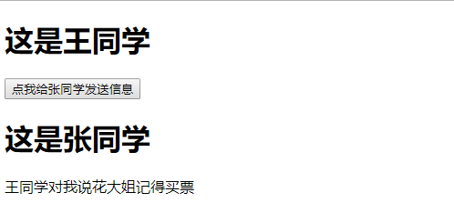 1 <div id="app"> 2 <wdb class="wdb"></wdb> 3 <zhwl class="zh"></zhwl> 4 </div> 5 <script> 6 let middle_tool=new Vue(); 7 let wdb={ 8 template:`<div> 9 <h1>这是王同学</h1> 10 <button @click="w_click">点我给张同学发送信息</button> 11 </div>`, 12 methods:{ 13 w_click:function () { 14 middle_tool.$emit('houhou','花大姐记得买票') 15 } 16 } 17 }; 18 let zhwl={ 19 template: `<div> 20 <h1>这是张同学</h1> 21 <P>王同学对我说{{say}}</P> 22 </div>`, 23 data(){ 24 return{ 25 say:'', 26 } 27 }, 28 mounted(){ 29 let that=this; 30 middle_tool.$on('houhou',function (data) { 31 that.say=data; 32 }) 33 } 34 }; 35 const app=new Vue({ 36 el:'#app', 37 components:{ 38 zhwl:zhwl, 39 wdb:wdb, 40 } 41 }) 42 </script>