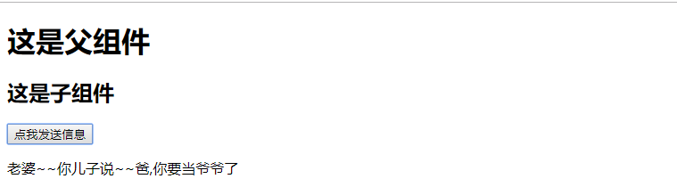 1 <div id="app"> 2 <father></father> 3 </div> 4 <script> 5 let child={ 6 template:`<div> 7 <h2>这是子组件</h2> 8 <button @click="my_click">点我发送信息</button> 9 </div>`, 10 methods:{ 11 my_click:function () { 12 this.$emit('son_say','爸,你要当爷爷了'); 13 } 14 } 15 }; 16 let father={ 17 template: `<div> 18 <h1>这是父组件</h1> 19 <!--// 接收这个事件--> 20 <child @son_say="my_son_say"></child> 21 <p>老婆~~你儿子说~~{{msg}}</p> 22 </div>`, 23 components: { 24 child: child 25 }, 26 data(){ 27 return{ 28 msg:'' 29 } 30 }, 31 methods: { 32 my_son_say:function (data) { 33 this.msg=data; 34 } 35 } 36 }; 37 const app=new Vue({ 38 el:'#app', 39 components:{ 40 father:father, 41 } 42 }) 43 </script>