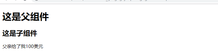 1 <div id="app"> 2 <father></father> 3 </div> 4 <script> 5 let child={ 6 template:`<div> 7 <h2>这是子组件</h2> 8 <p>父亲给了我{{money}}美元</p> 9 </div>`, 10 props:['money'] 11 }; 12 let father={ 13 template:`<div> 14 <h1>这是父组件</h1> 15 <child :money="num"></child> 16 </div> 17 `, 18 data:function () { 19 return { 20 num:100, 21 } 22 }, 23 components:{ 24 child:child, 25 } 26 }; 27 const app=new Vue({ 28 el:'#app', 29 components: {father:father,} 30 }) 31 </script>