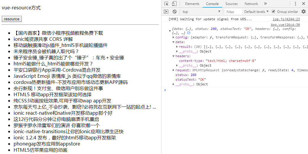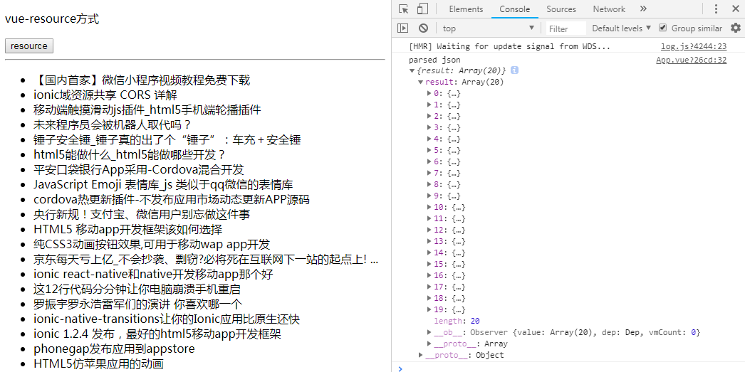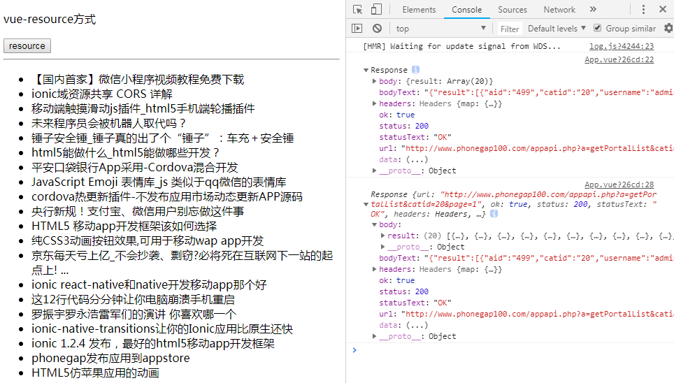 <template> <div> <p>vue-resource方式</p> <button @click="getData()">resource</button> <hr /> <ul> <li v-for="item in list"> {{item.title}} </li> </ul> </div> </template> <script> export default { name: "app", data() { return { list:[] } }, methods:{ getData(){ //请求数据 var api = 'http://www.phonegap100.com/appapi.php?a=getPortalList&catid=20&page=1'; this.$http.get(api).then(function (response) { console.log(response) //注意this指向 this.list = response.body.result; },function (err) { console.log(err) }) } } } </script>