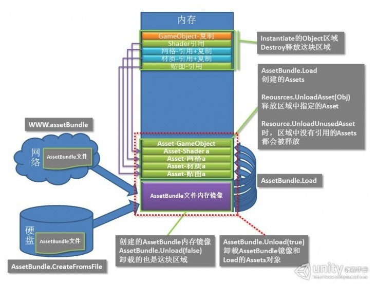用AssetBundle.Load(同Resources.Load) 这才会从AssetBundle的内存镜像里读取并创建一个Asset对象,创建Asset对象同时也会分配相应内存用于存放(反序列化)