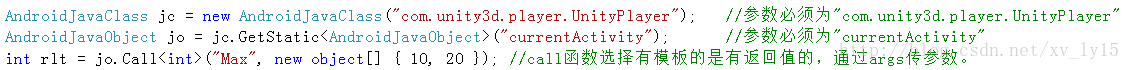 (注:初步了解这里的参数之所以填”com.unity3d.player.UnityPlayer”和”currentActivity”,是因为在生成jar文件的时候,已经指定了MainActivityclass继承UnityPlayerActivity,也在XML指定了MainActivity是Main class)