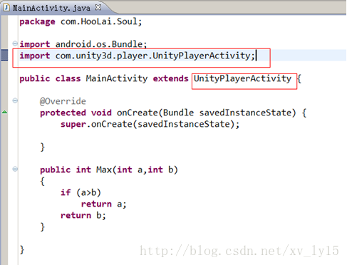 添加unityActivity,使MainActivity继承UnityPlayerActivity,并把SetContentView函数删掉(不然到手机上启动程序的时候就会只看到一句HelloWorld),这里用一个比较函数Max作为例子,有参数,有返回值
