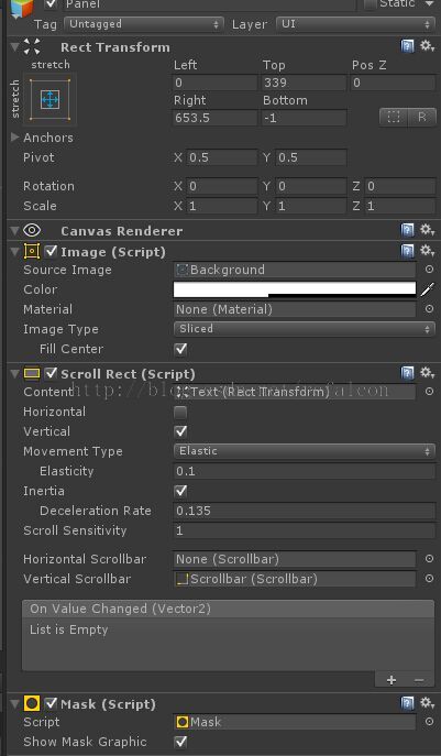 设置Panel的属性如下,加上ScrollRect、Mask组件,将content设置为我们的文本框