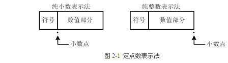 所谓定点格式,即约定机器中所有数据的小数点位置是固定不变的。通常将定点数据表示成纯小数或纯整数。为了将数表示成纯小数,通常把小数点固定在数值部分的最高位之前;而为了把数表示成纯整数,则把小数点固定在数值部分的最后面,如图2-1所示。