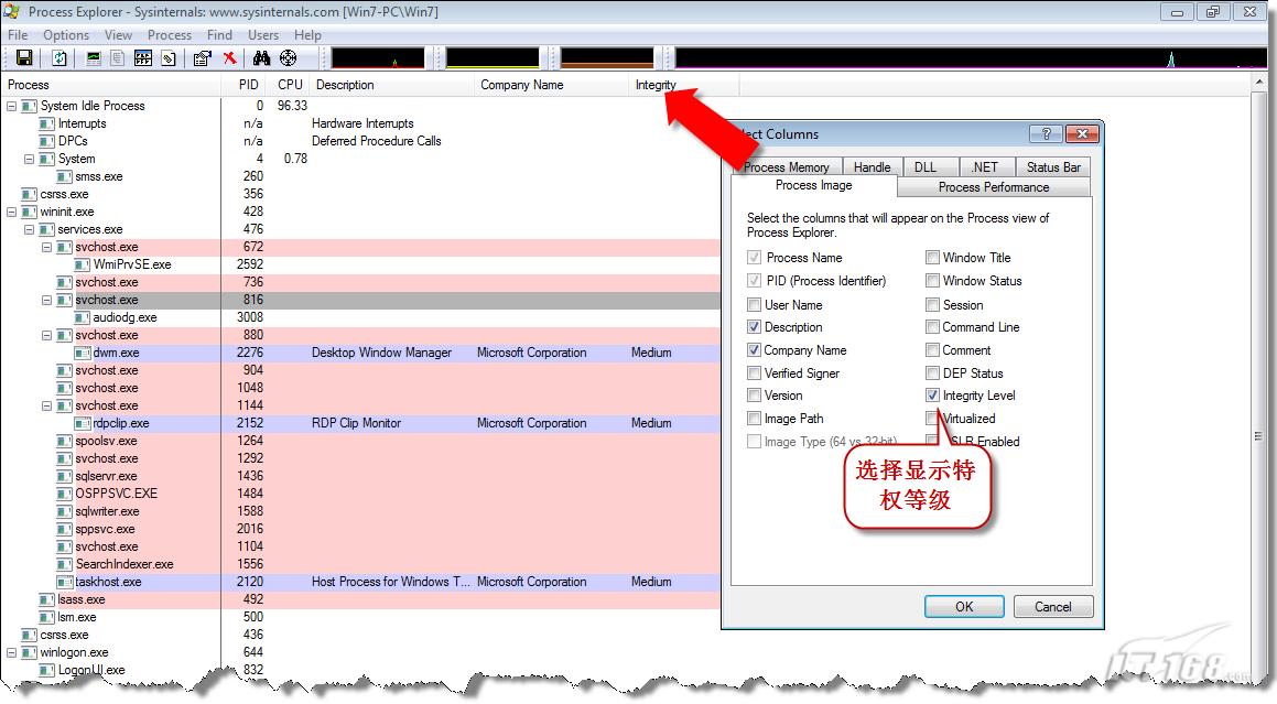 这将导致系统会运行两种不同类型,不同特权等级的进程(当然,从技术上讲这两个进程都是在同一用户下)。我们可以使用Windows Sysinternals工具集中的进程浏览器(Process Explorer)查看各个进程的特权等级。 (http://www.microsoft.com/technet/sysinternals)
