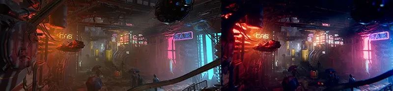 左边没有使用后期处理功能,右边使用了全栈的后期处理功能
