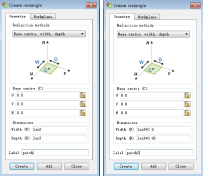 天线模型:点击菜单“Construct”,选择“Rectangle”,弹出“Create Rectangle”对话框,如图2