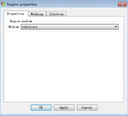 在左侧树型栏的“Geometry”中,选中substrate,在详细树型栏中,展开其“Regions”,选择“Region”,点击鼠标右键选择“Properties”,在弹出的“Region properties”对话框中,设置Medium为“substrate”,点击“OK”;如图6