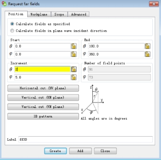 点击“3D pattern”,修正步长“Increment”中Theta 的值为2,Label: ff3D,点击Add;点击“Vertical cut(UN plane)”按钮,修正步长“Increment”中Theta 的值为1,label:ffXOZ,点击“Create”。如图11