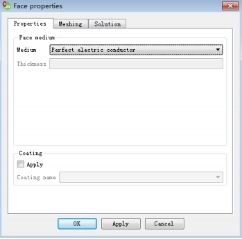 在三维视图中,选择介质体的底部平面,点击鼠标右键,选择“Properties”,在弹出的“Face properties”对话框中,设置Medium为“Perfect electric conductor”,点击“OK”;如图7